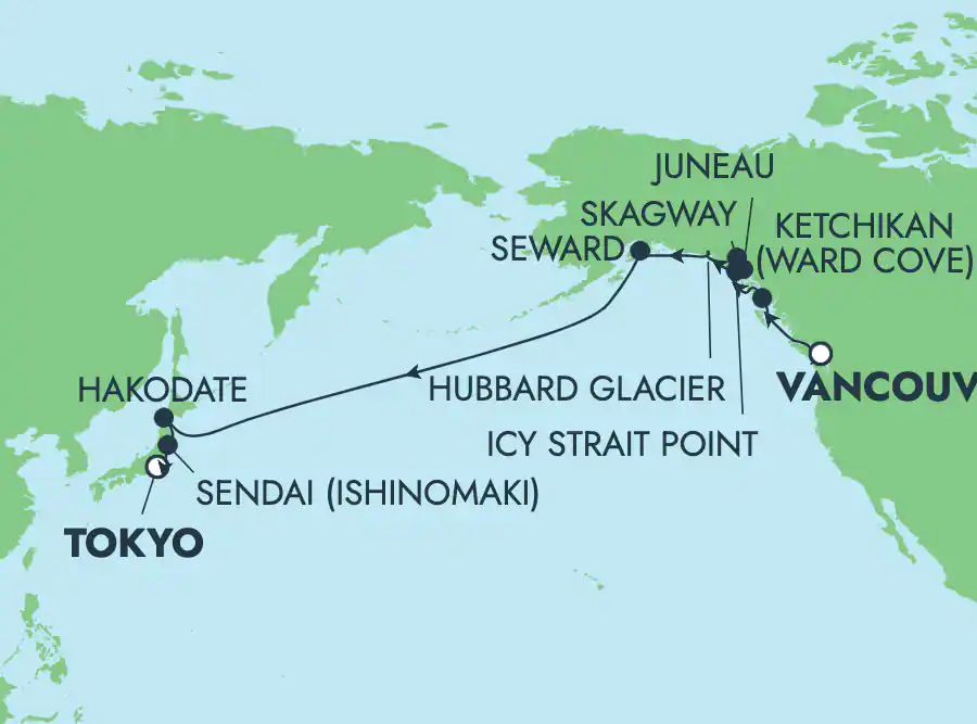 캐나다 밴쿠버에서 시작하여 일본 도쿄(요코하마)에 이르는 이 18일간의 항해는 일반적인 알래스카 크루즈의 한계를 넘어선 특별한 경험을 선사합니다. 알래스카의 경이로운 빙하 지대를 지나 태평양의 수평선을 가로지르는 이 여정은 크루즈 여행의 정점이라 할 수 있습니다.